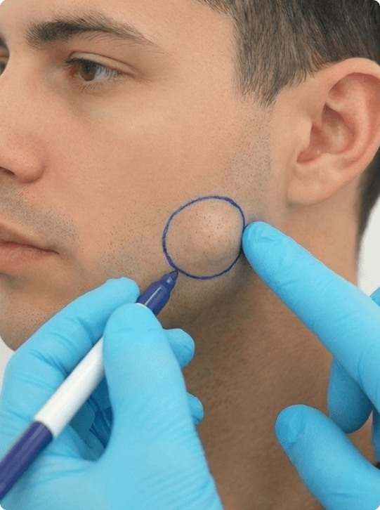 The cyst is assessed to confirm its type, size and depth, and the area is carefully marked to ensure accurate and complete removal.